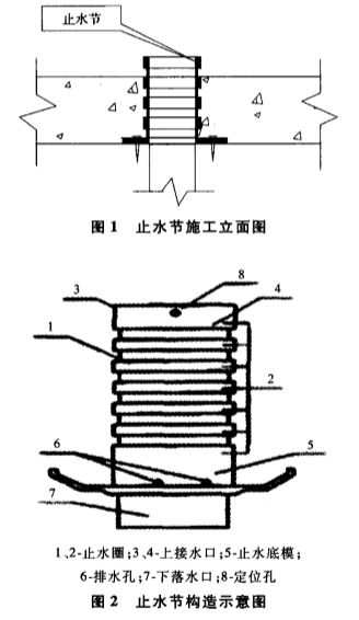 一般工程中樓板發生漏水的主要原因:一是管道壁與混凝土的交界面漏水;二是防水套管與管道之間的填塞不嚴密;三是混凝土施工效果差。其中第一個原因可以加套管解決,第二個原因主要是一些填塞材料選擇不當,或者施工方偷工減料造成的滲漏。因第二種原因導致的滲漏隱蔽性強,在施工過程中很難發現。通過止水節來代替防水套管能夠很好地消除這樣的質量隱患,圖1為止水節施工立面圖,圖2為止水節構造示意圖。