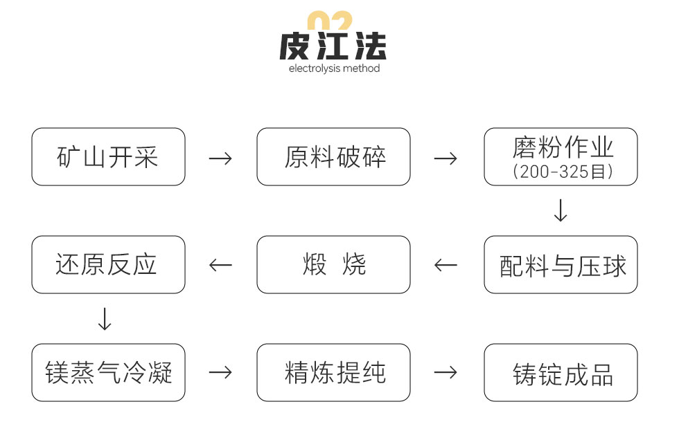 礦山開采→原料破碎→磨粉作業(200-325目)→配料與壓球→煅燒→還原反應→鎂蒸氣冷凝→精煉提純→鑄錠成品